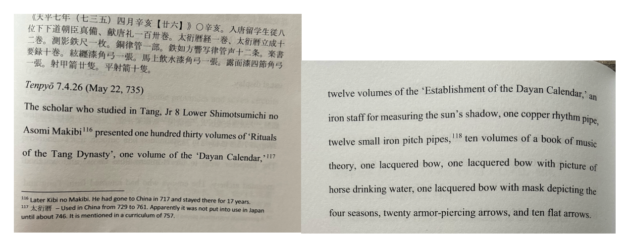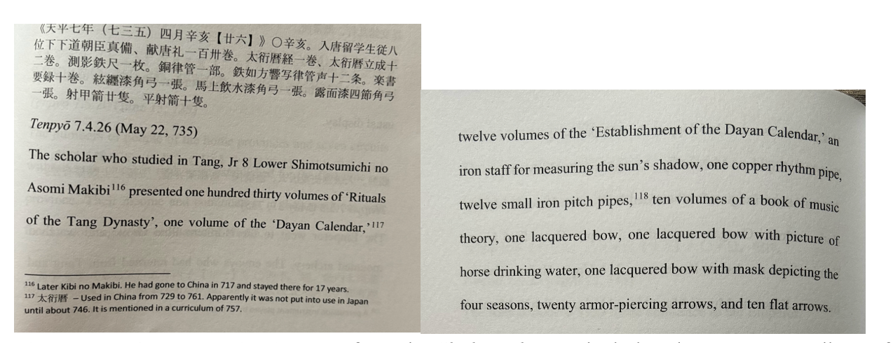 Figures 5 (left) and 6 (right). Entry from the Shoku Nihongi, depicting the court proceedings of a scholar who studied in the Tang, upon his return to Japan. Adapted from Bender, Emperor Shomu, 285-286. Photograph taken by the author.