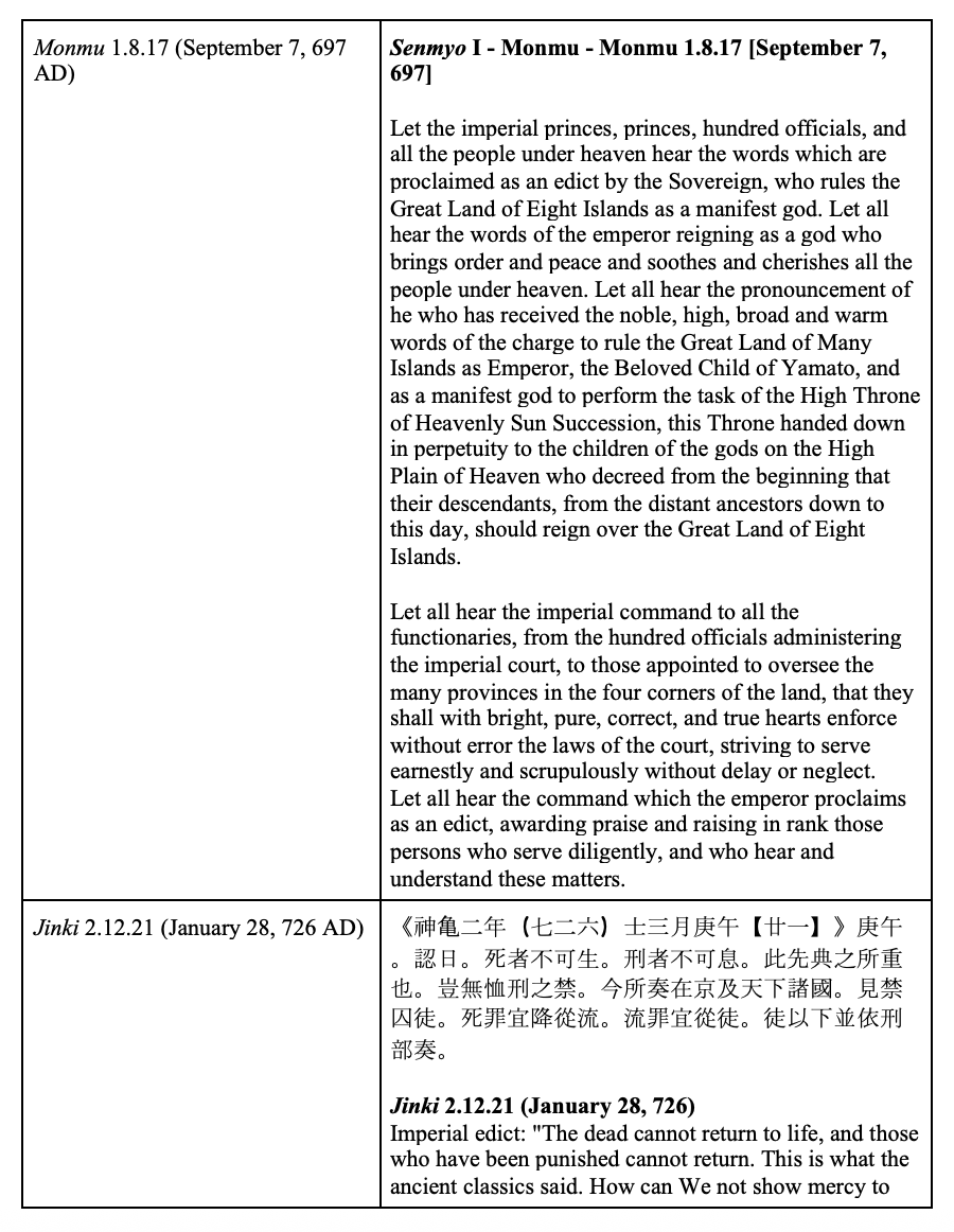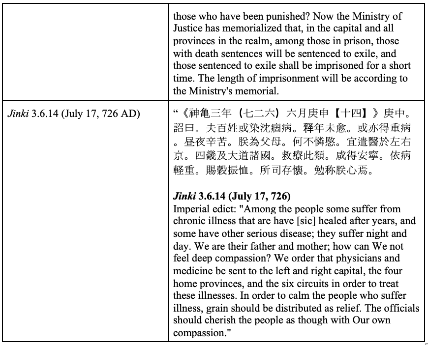Figure 9. Table depicting Monmu 1.8.17, Jinki 2.12.21 (1/28/726 AD), and Jinki 3.6.14 (7/17/726 AD), all imperial edicts. Adapted from Bender, Senmyo, 32-33; Bender, Emperor Shomu, 97, 103-104.
