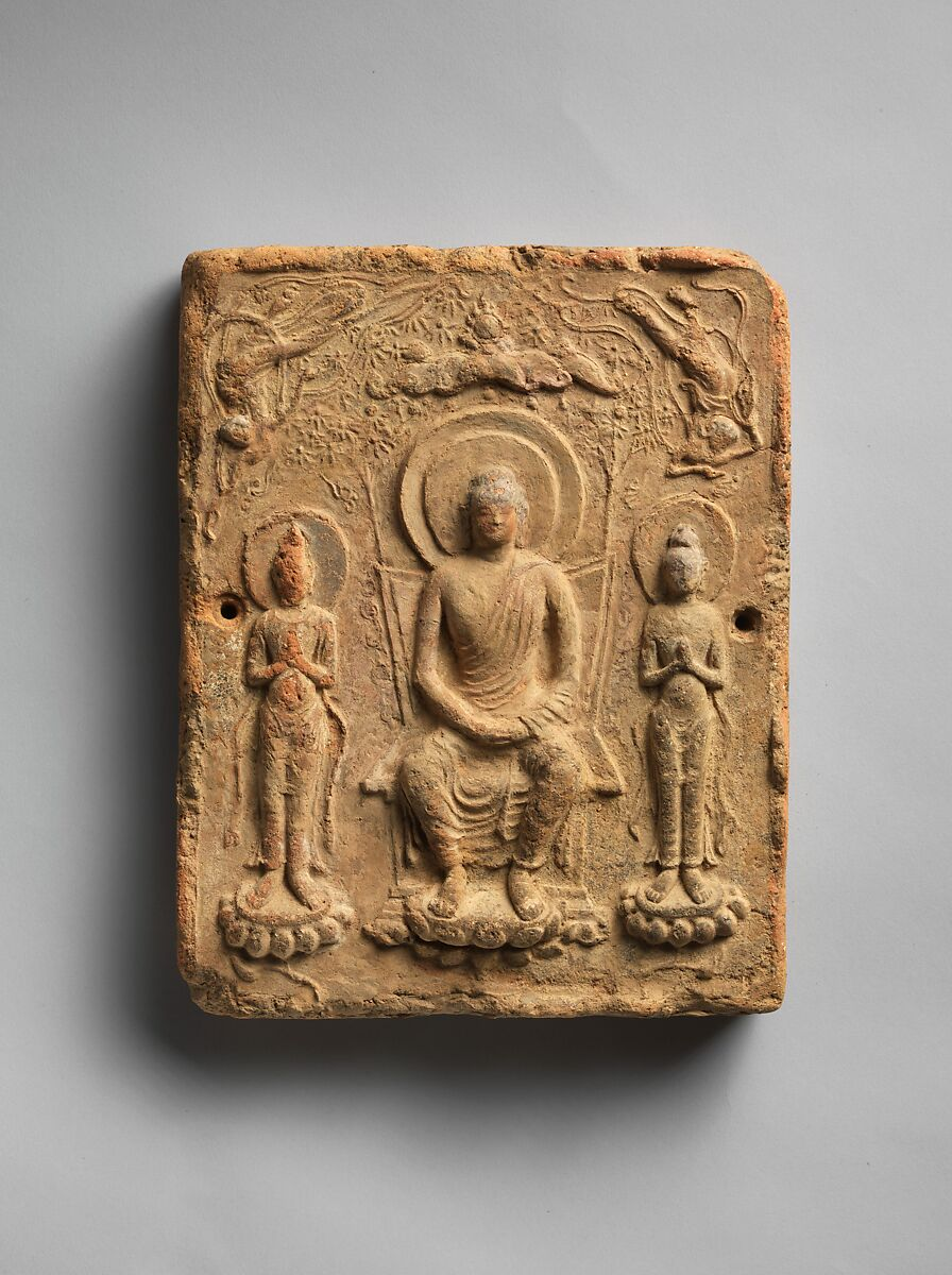 Top: Tile with Buddha Triad. Second half of the 7th century, Asuka Period (538-710), Japan. Earthenware, H. 9 5/8 in. (24.5 cm); W. 7 3/4 in. (19.7 cm); D. 1 1/2 in. (3.8 cm). Sourced from the Metropolitan Museum of Art, Mary Griggs Burke Collection, Gift of the Mary and Jackson Burke Foundation, 2015. https://www.metmuseum.org/art/collection/search/53158.