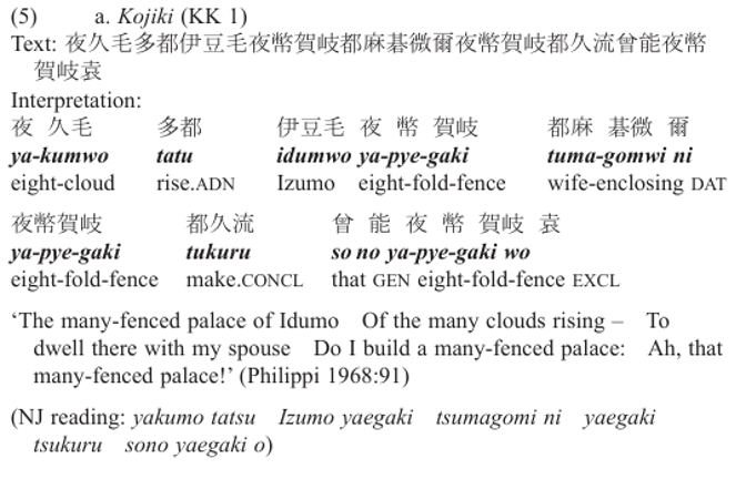 Fig. 2. Diagram of the man'yōgana script in the Kojiki (written 712 AD). The characters here are based off of the reconstructed Old Japanese pronunciation (with New Japanese reading provided below), and would otherwise be gibberish in classical Chinese. Adapted from Frellesvig, History, 19.