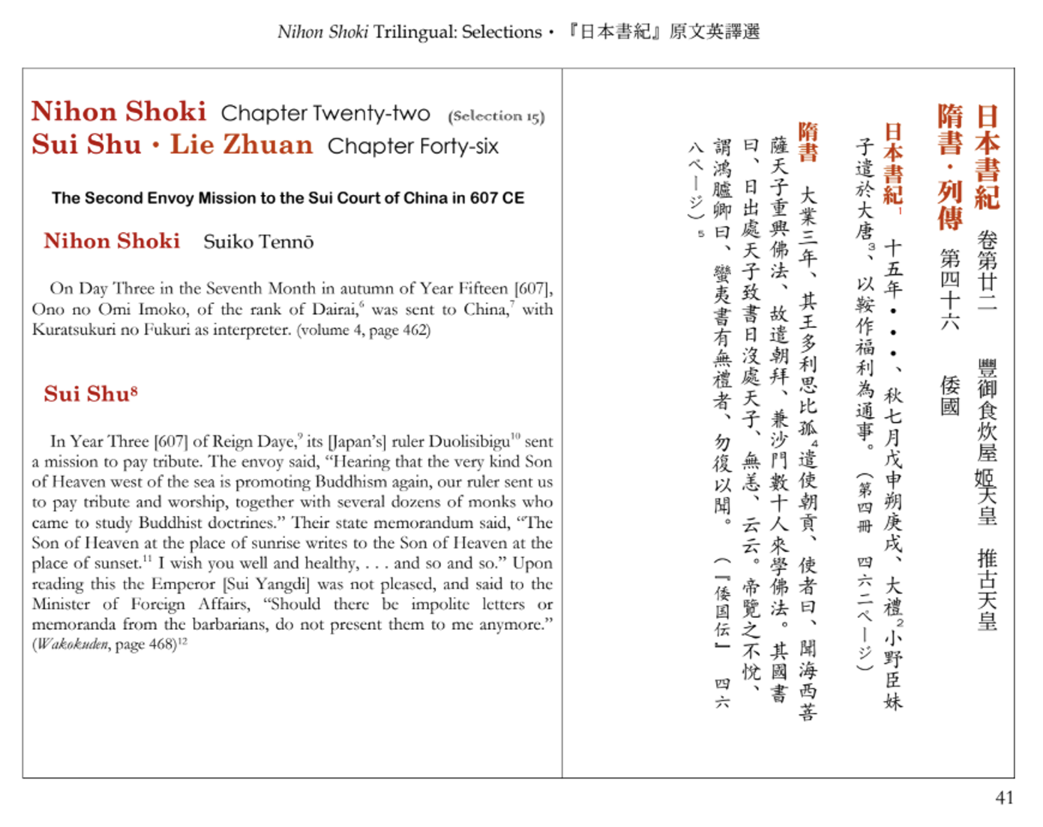 [27] Louis Chor, “Nihon Shoki (日本書紀) Trilingual: Selections in the Original Classical Chinese (Kanbun) with English Translation based on the Iwanami Bunko edition (five volumes, 1994-1995),” University of Alberta Education and Research Archive, Published Feb 6 2018; revised Jan 8 2023. https://era.library.ualberta.ca/items/1547506a-fb60-4529-a439-2f984e64f95c/view/438ac689-8e4a-4db7-9026-265bcbc92784/Nihon-Shoki-Trilingual-January-8-2023.pdf..
