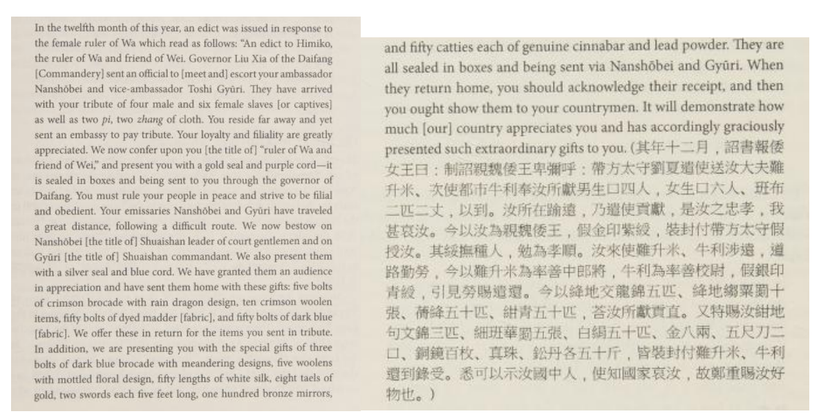 Figures 3 (left) and 4 (right). Entry from the San Guo Zhi, depicting a decree enumerating the tributes received and the gifts and titles bestowed to Wa in reciprocation. Adapted from Saeki and Fogel, Treatise on the People of Wa, 269-270.
