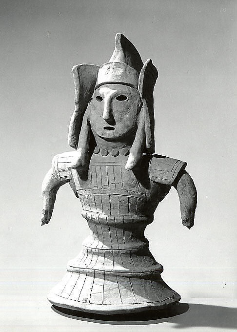 Haniwa Figure of a Warrior. Kofun Period (c. 300-710 CE). Earthenware with painted, incised, and applied decoration, 22 7/8 in. Sourced from the Metropolitan Museum of Art, The Michael C. Rockefeller Memorial Collection, Gift of Mrs. John D. Rockefeller III, 1958. https://www.metmuseum.org/art/collection/search/45545.