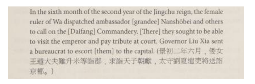 Figure 7. Entry from the San Guo Zhi, depicting foreign relations between the Wa state under Empress Himiko (r. 180-247/248 AD). Adapted from Saeki and Fogel, Treatise on the People of Wa, 263.