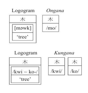 Fig. 1. Diagram of the difference in pronunciation between ongana and kungana. The Old Japanese word for “tree” had the variants “/ko/” and “/kwi/”, whereas the ongana “/mo/” was borrowed from the phonetic manifestation of the Chinese pronunciation of the word, similar to the Old Japanese syllable “/mo/”. Adapted from Frellesvig, History, 15.