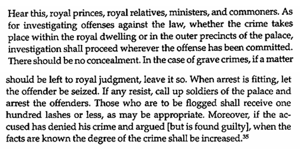 By the same token, one of Tenmu’s largest contributions to the Japanese legal corpus was the elaboration of the Justice Ministry which allowed him to create a bureaucratic office that controlled the deployment of punishments on a scale previously unprecedented.[41] The laws themselves were also highly inspired by the existing Tang law code, written in 624 AD and promulgated in 653 AD under Emperor Gaozong of Tang (r. 649-683). A royal edict in 682 AD showcases the extent of criminal justice and the newfound power of the Justice Ministry to maintain order on behalf of the king (Figure 8). Here, we can see that crimes were treated matter of fact, without concealment, regardless of the location of the crime. The slight caveat that “grave crimes” were left to the hands of the crown, however, could suggest a slight preferential treatment in crimes committed by elites and crimes committed by a non-elite or lower elite. Such attitudes are also visible in Chinese criminal law. The Tang law code theoretically held that “throughout the empire a particular crime would be met with precisely the same punishment”, but at the same time “much of the section of the code on General Principles is devoted to guaranteeing some classes of persons a reduction of punishment for certain types of offenses, and/or the right to pay a fine instead.”[42] Evidently, both Tenmu’s edict and the Tang law code solidify the role of the emperor as the rightful link between heaven and the earth, and the center of administration. The centralized and bureaucratic machine emphasized here by the Asuka/Nara emperors and their Tang counterparts in their respective empires highlights a push to extend and protect monarchical power throughout their territories. Tenmu’s claim as the rightful and virtuous ruler of all under heaven is further stressed by his inclusion of “royal princes, royal relatives, ministers, and commoners.” By including every being under the sun as belonging under his jurisdiction, his position as emperor became transcendent, omnipotent, omnipresent, and above all, fair. Thus, the kingship of the Japanese state took on a form that was a far cry from the supraregional confederation of the Yamato period, with the ideal of a sovereign no longer a local problem-solver but rather the primary benefactor and guardian of a kingdom.