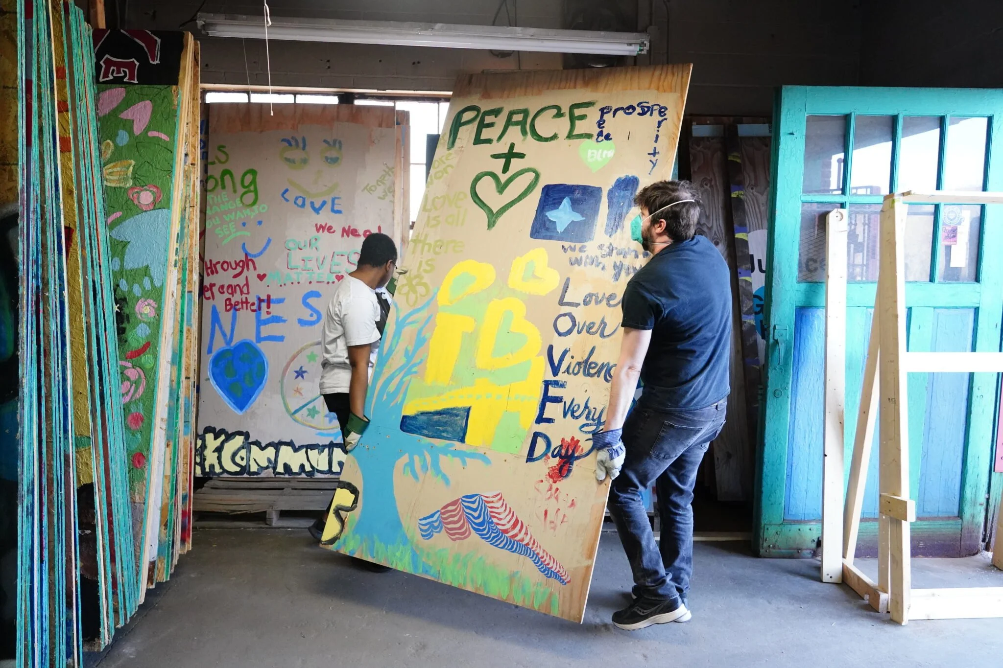 Figure 2. Amira McLendon, the exhibition’s co-curator, and another volunteer move around the plywood piece in their storage unit. Minnesota Reformer photo, https://wisconsinexaminer.com/2022/05/30/minneapolis-story-memorialize-the-movement/