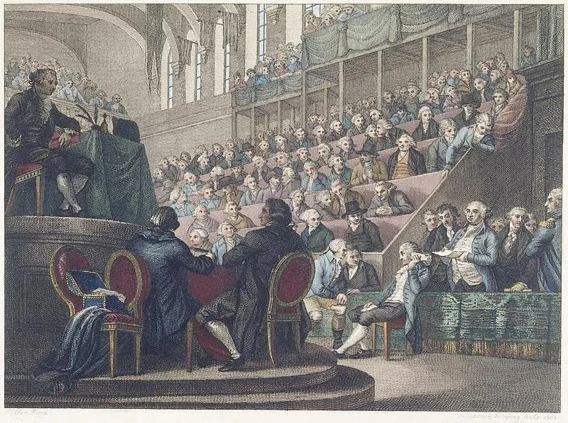 Figure 1. The trial of King Louis XVI of France, 1792; engraving by Reinier Vinkeles, c. 1793-96. King Louis XVI is seen in the lower right, holding a sheet of paper from which he reads his defense.