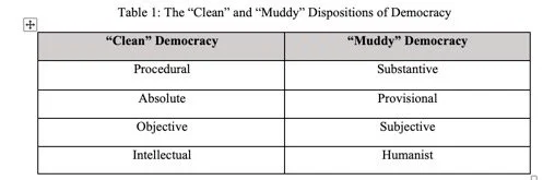 I began by addressing a popular divide in defining democracy as either substantive or procedural, maximal or minimal, thick or thin. But this dispute over the formal characteristics of democracy is only a small (yet significant) part of the larger dichotomy between what I call the “clean” temperament of democracy and the “muddy” temperament of democracy. “Clean” because it emphasizes the institutions and principles of democracy as uncontaminated from how they are normatively experienced by human beings; “muddy” because it emphasizes the constituents of democracy to be thoroughly contaminated with the complexities and particularities of normatively experienced human influences. This method of analysis borrows from James’ “tender-minded versus tough-minded”[3] distinction, but it has been contextualized with salient differences to capture the idiosyncrasies of the democratic temper. [4] Table 1 lists the various discords encapsulated by this dualism: