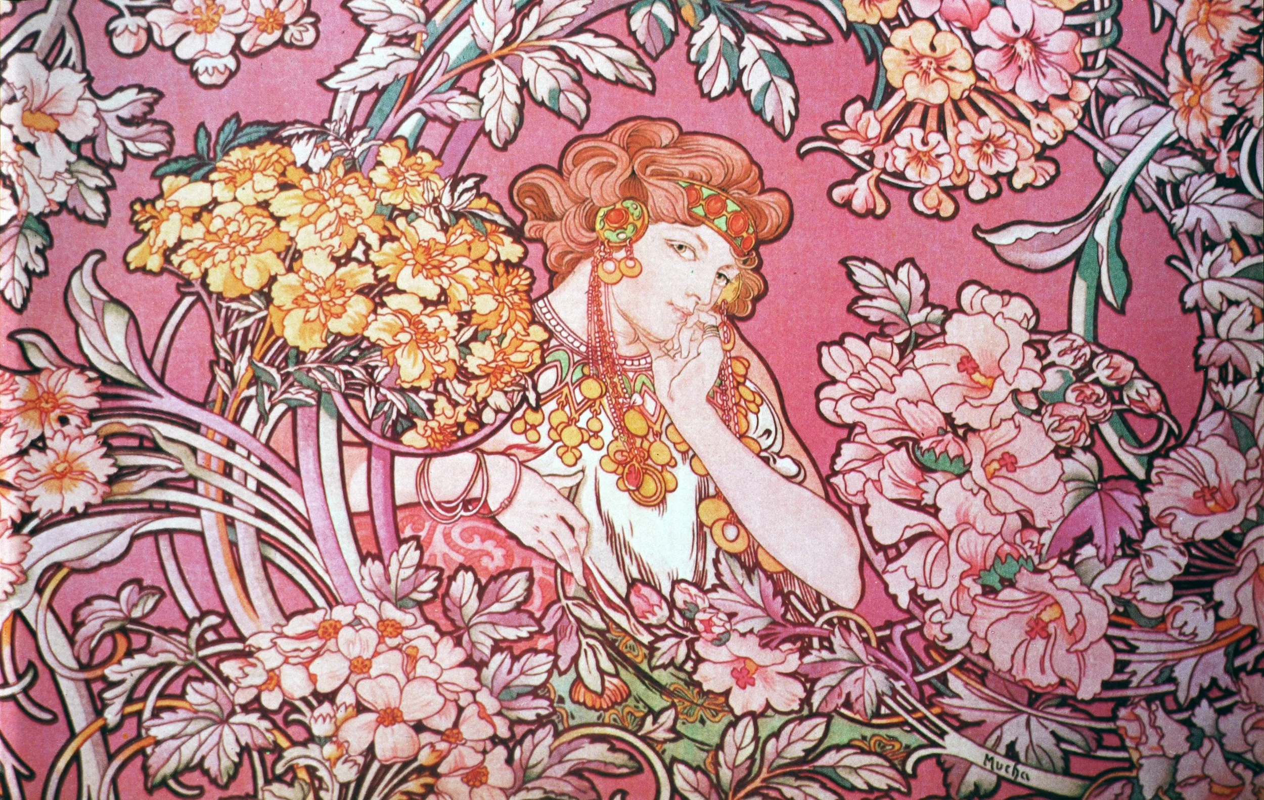 "Alphonse Mucha - P40 Femme Parmi Les Fleurs/Woman Among The Flowers, c.1900." by K.G.23 is marked with CC0 1.0.
