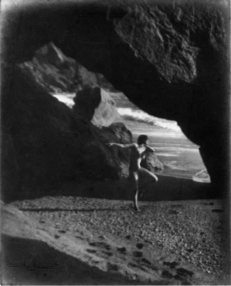 After 1911, Brigman “retrofitted the narrative cycle of her photographs away from the Sierran nature spirits toward a saga that told of her personal struggle toward freedom of the body and soul.”28 This fact is emulated in a comparison of Ballet de Mer (Fig. 5), made in 1913 with The Lone Pine (Fig. 1), created in 1908. The former depicts a figure in motion—her movement so expressive it consumes her entire body. In addition to the figure’s outstretched arms, which act as a counter balance to her movement, the turn of the figure’s head away from the audience, as well as her bent left leg implies that she is dancing in a circle or a line. Conversely, Fig. 1 portrays a static figure, whose downcast head sinks toward her knees, decidedly grounded to the cliff. Hence, after this time period, Brigman’s photographs reveal feminine figures, whose bodies express emotions and symbolize universal experiences, such as emotional struggle, rather than merely being a part of their surroundings.